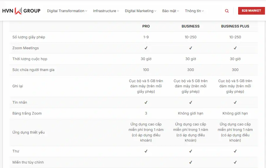 | Tính Năng | Zoom basic | Zoom Pro | Zoom Business | Zoom Business Plus |