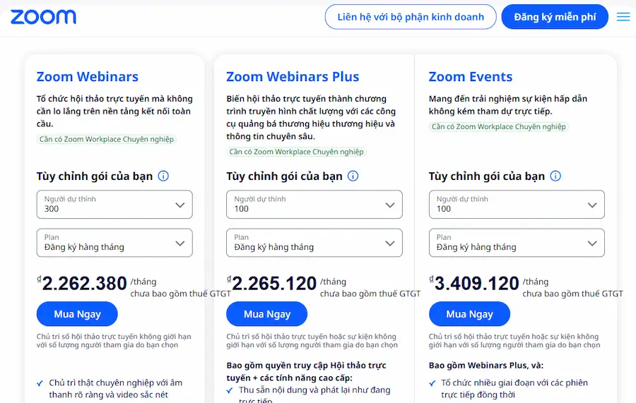 Chỉ họp cơ bản | Loại bỏ giới hạn thời gian 40p | SSO, Email Branding, 300 người | SSO, Ghi Cloud 10GB, Zoom Phone Essentials |